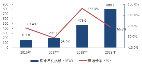圖1:中國(guó)已投運(yùn)光儲(chǔ)項(xiàng)目的累計(jì)裝機(jī)規(guī)模(2016-2019年)